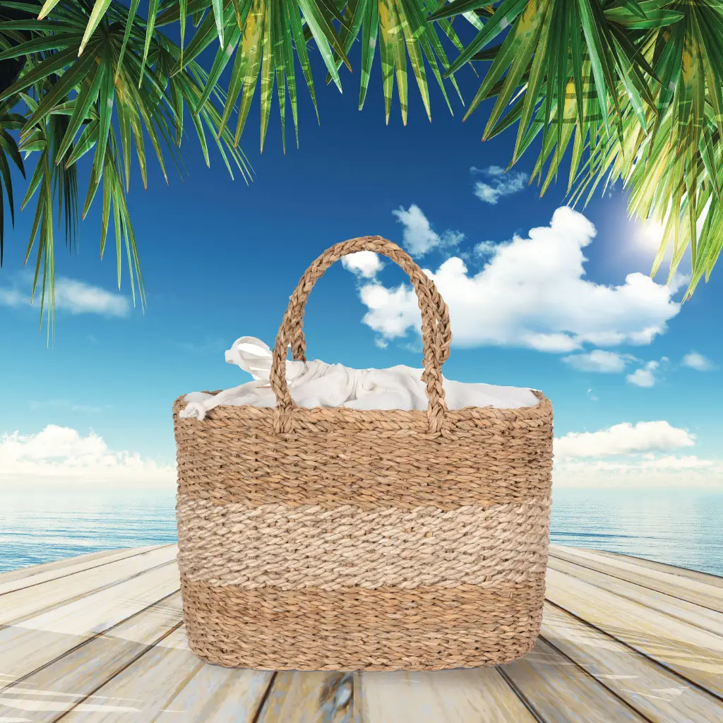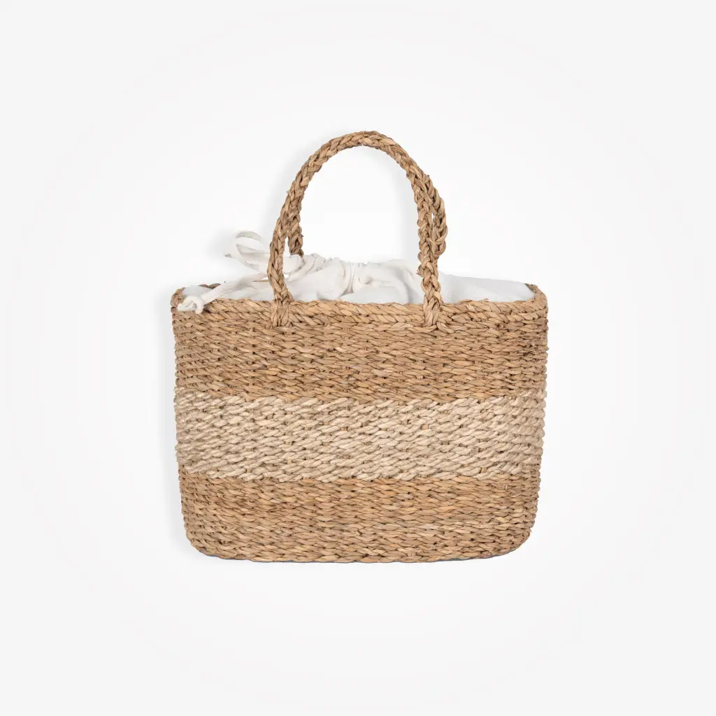Intrecciato a mano a partire da fibre vegetali di giunco marino e iuta.