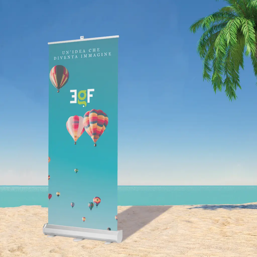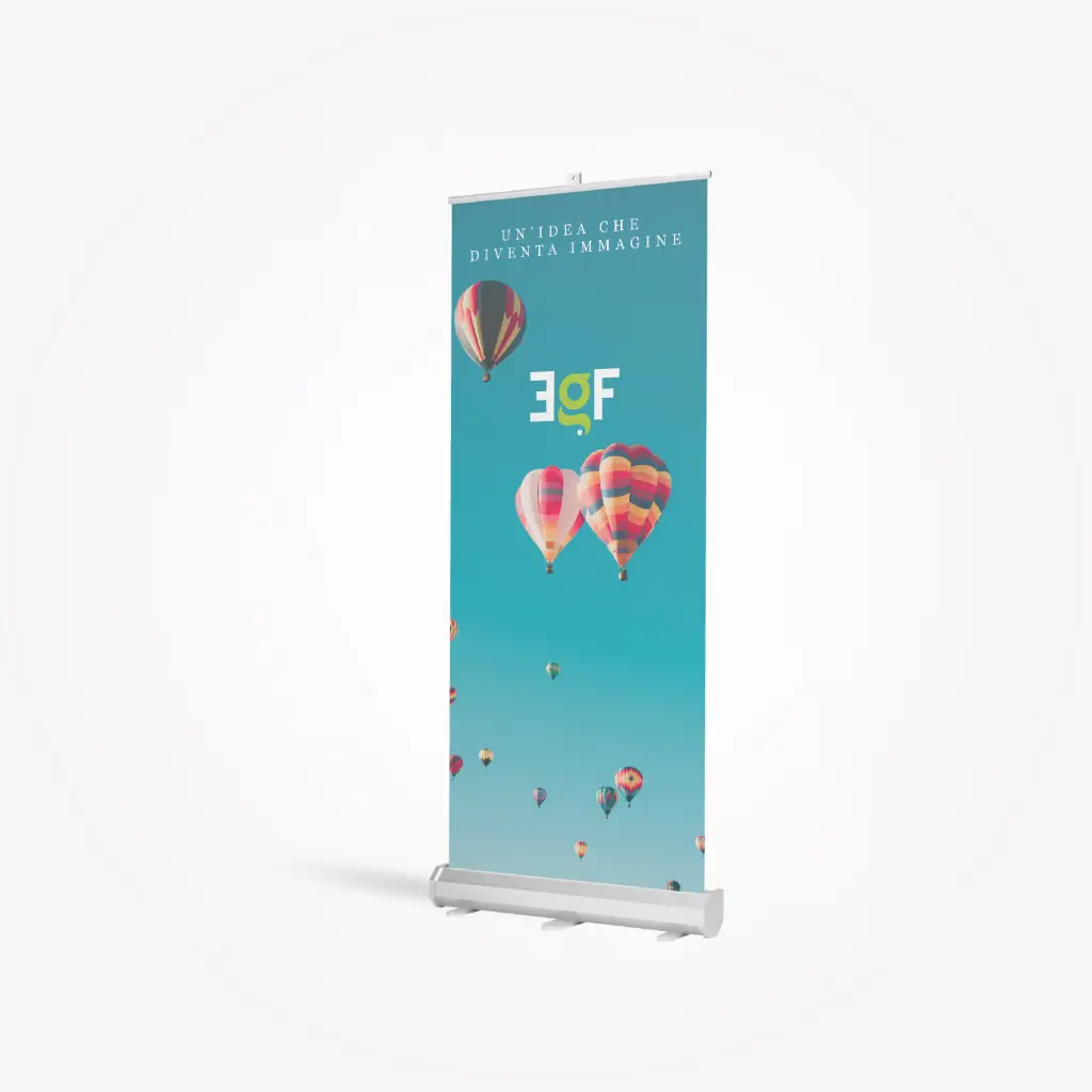 Il roll up comprende una struttura monofacciale composta da: base autoavvolgente, telo stampato, palo ripiegabile in tre parti, barra superiore con incastro, chiave di sblocco.