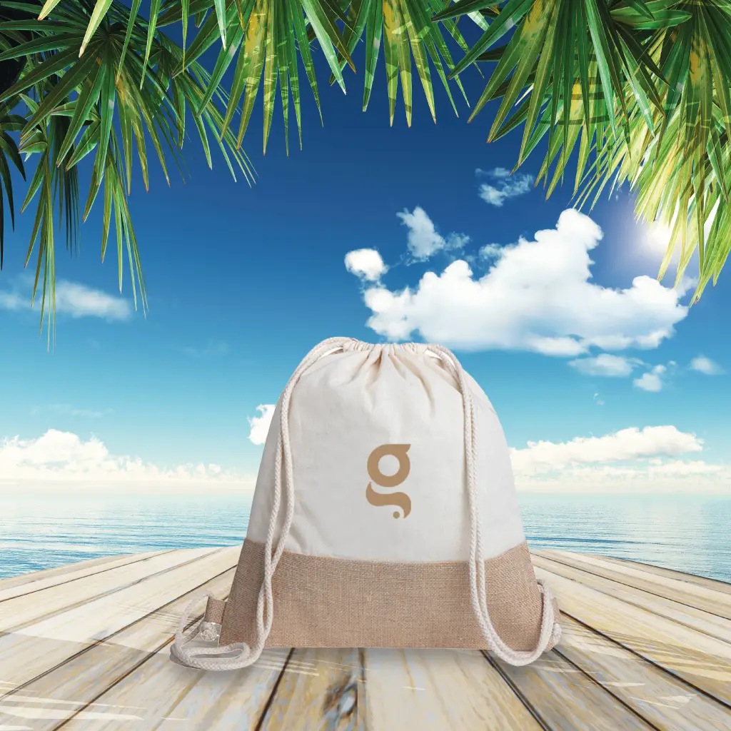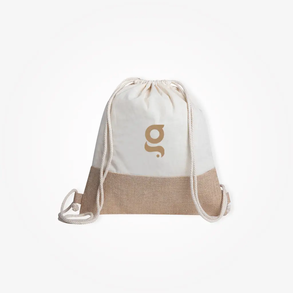 Sacca zaino cotone e juta, doppia corda di chiusura.
