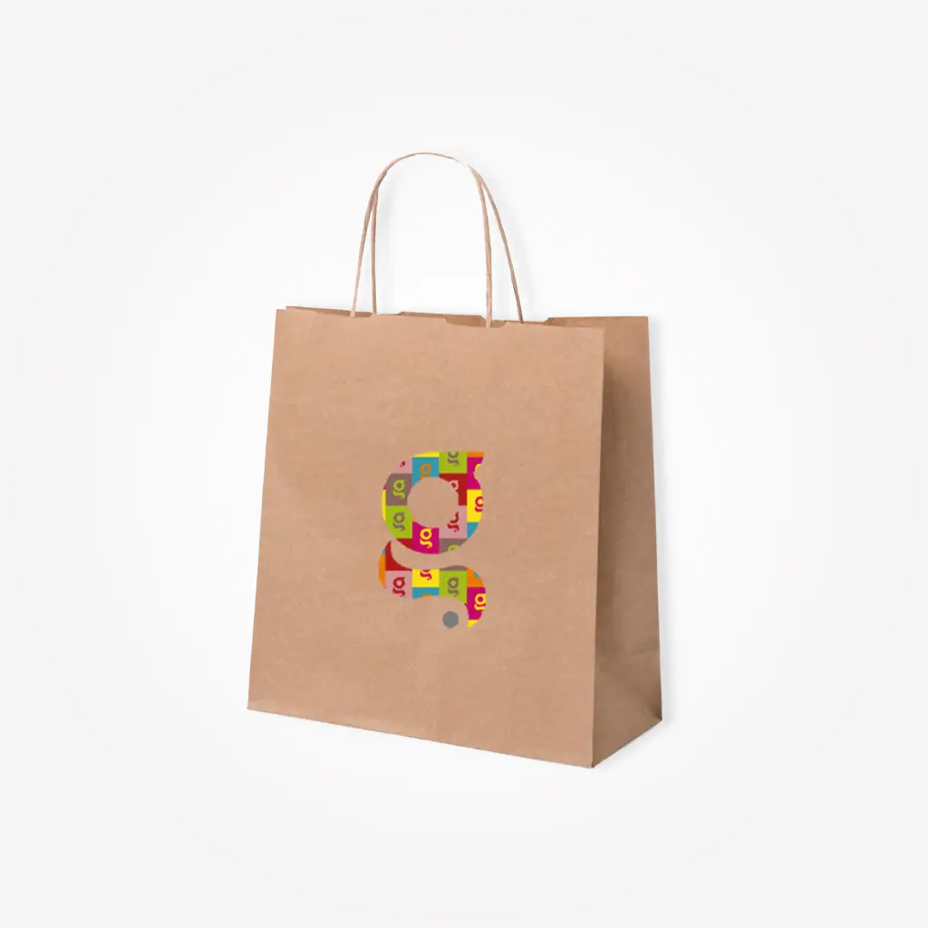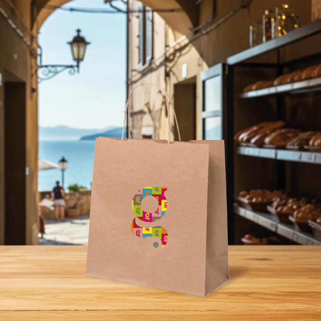 Shopper in carta da 100g/m2 con finitura naturale, manici corti rinforzati e soffietto.