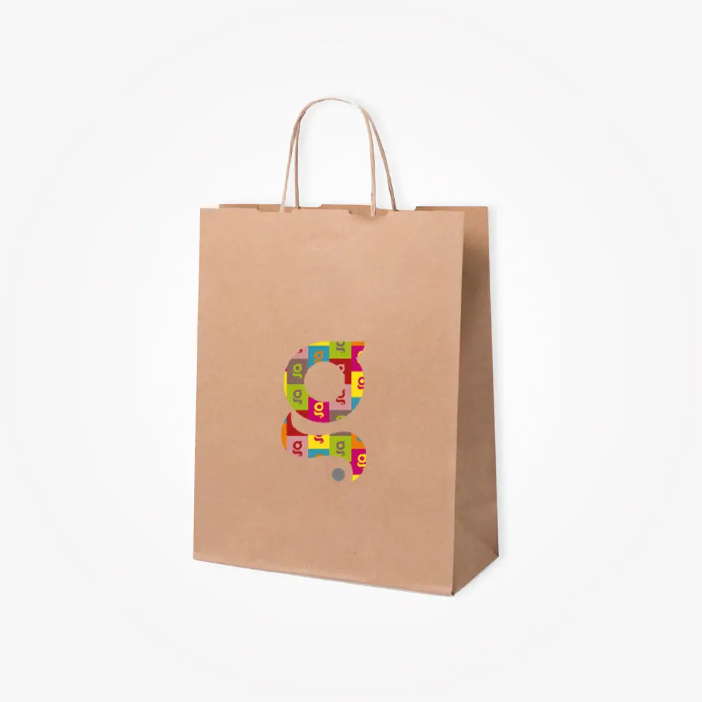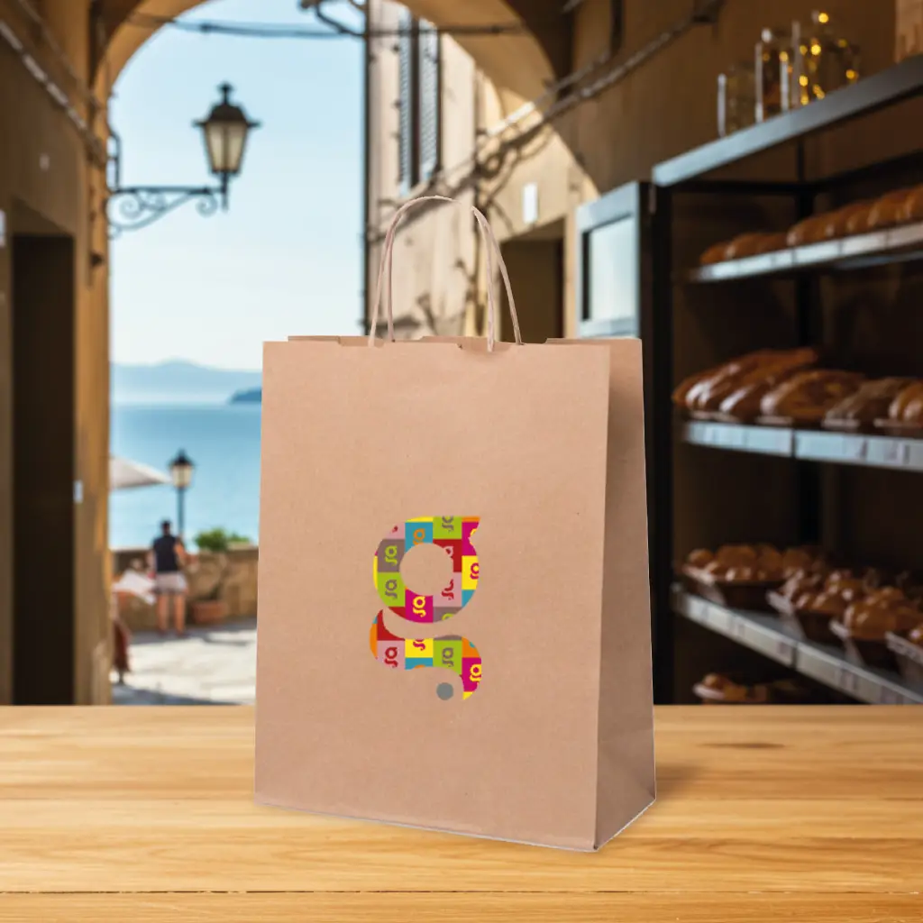 Shopper in carta da 100g/m2 con finitura naturale, manici corti rinforzati e soffietto.