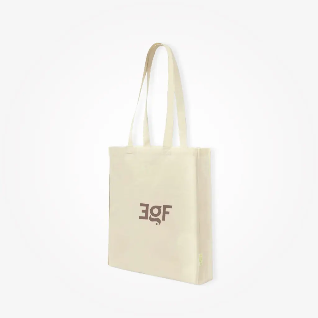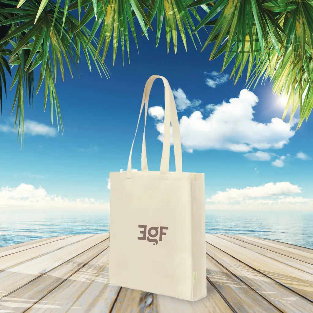 Shopper in robusto materiale 100% cotone 140 g/m² con finitura in colore naturale.