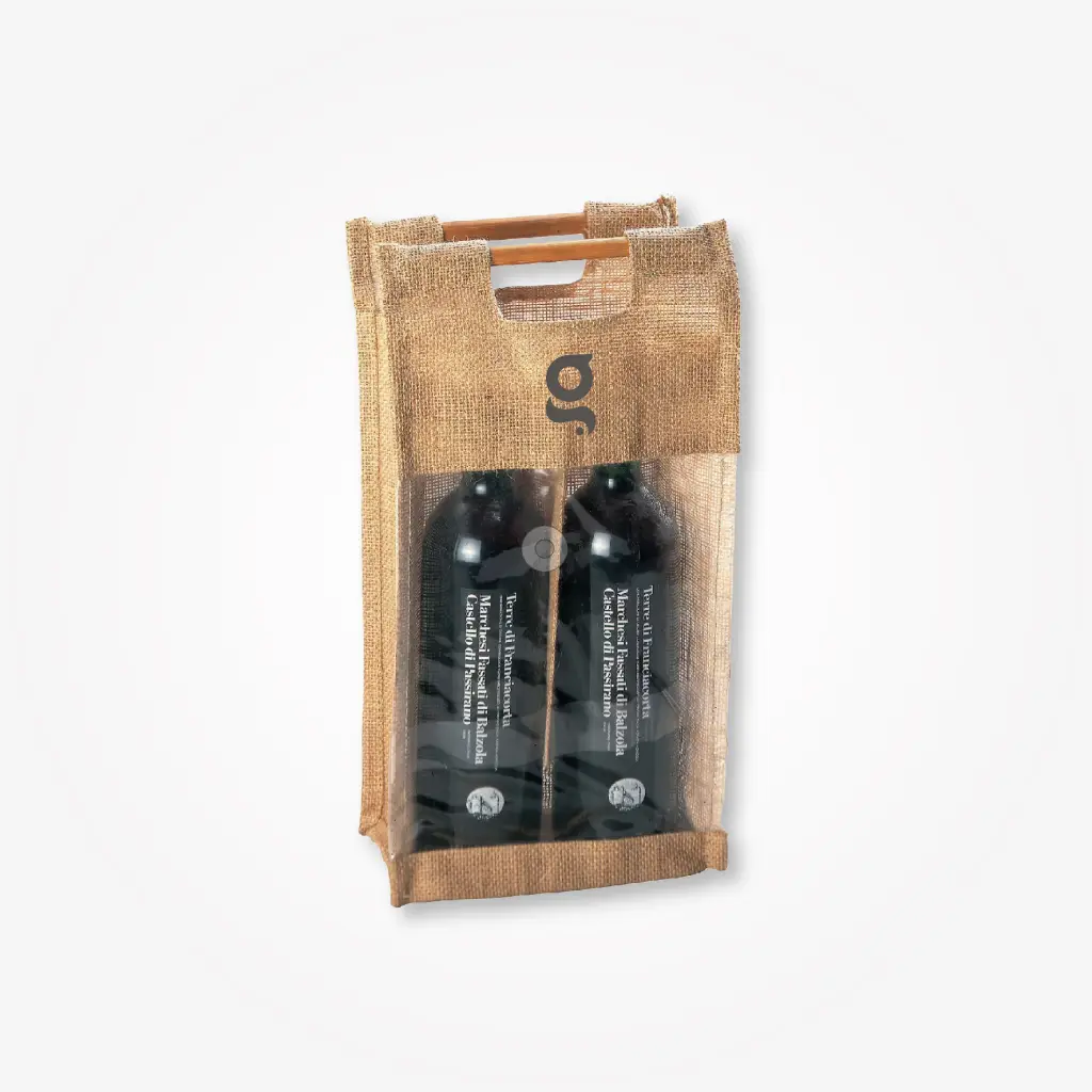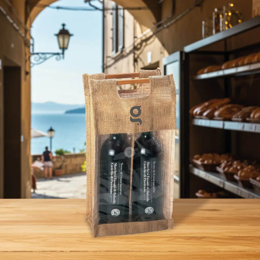 Borsa portabottiglie in juta, con finestra in PVC trasparente e manici in bamboo.