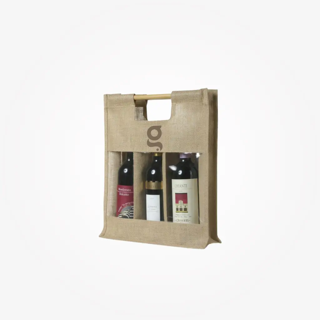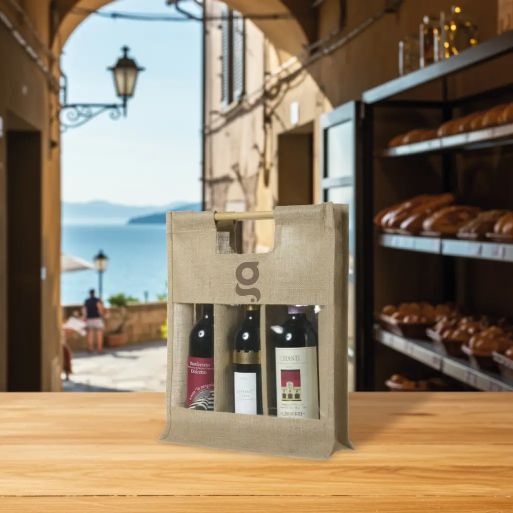 Shopper con manici in canna e finestra frontale in plastica trasparente.