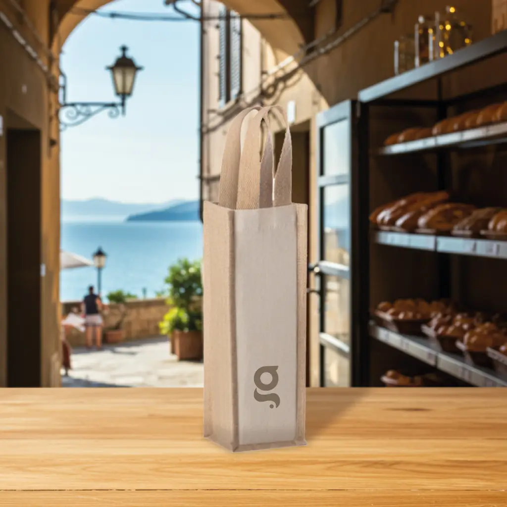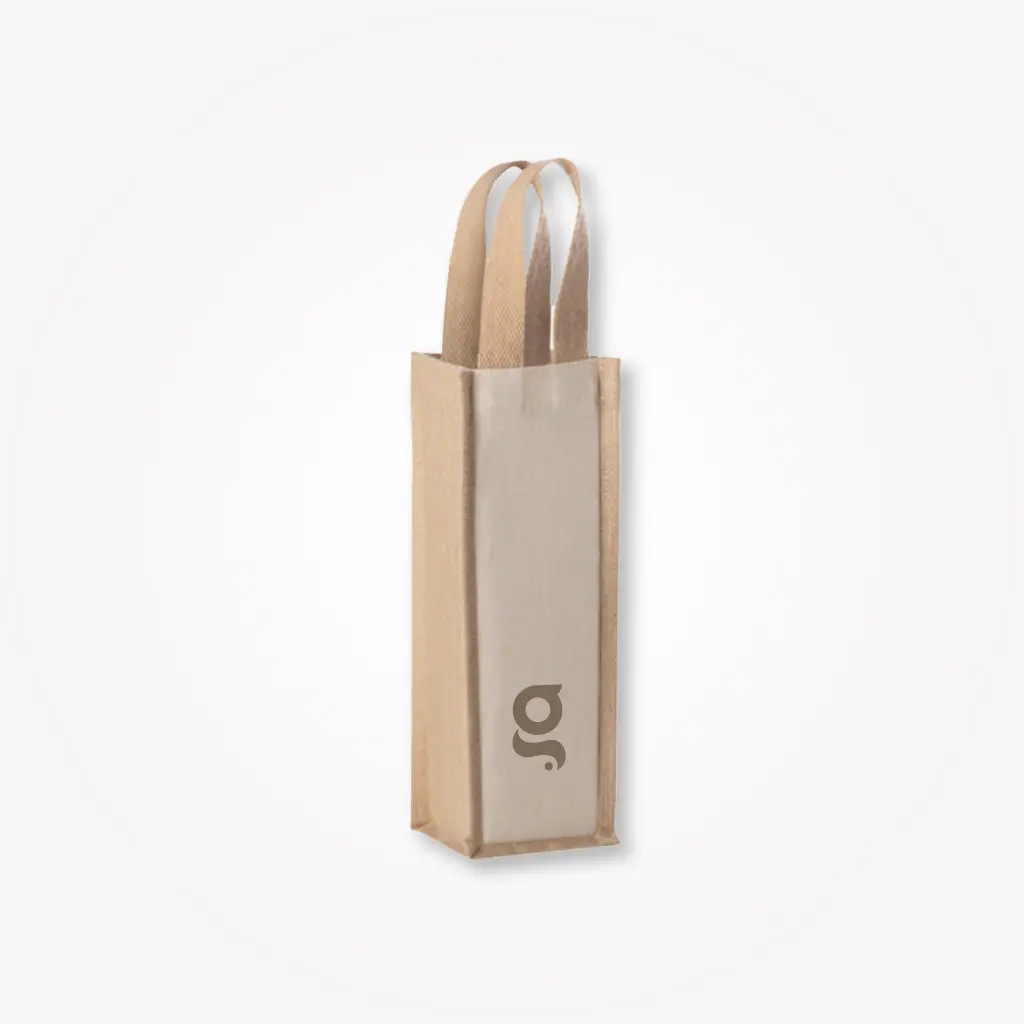 Shopper portabottiglie in cotone laminato e juta, con soffietto e manici corti.